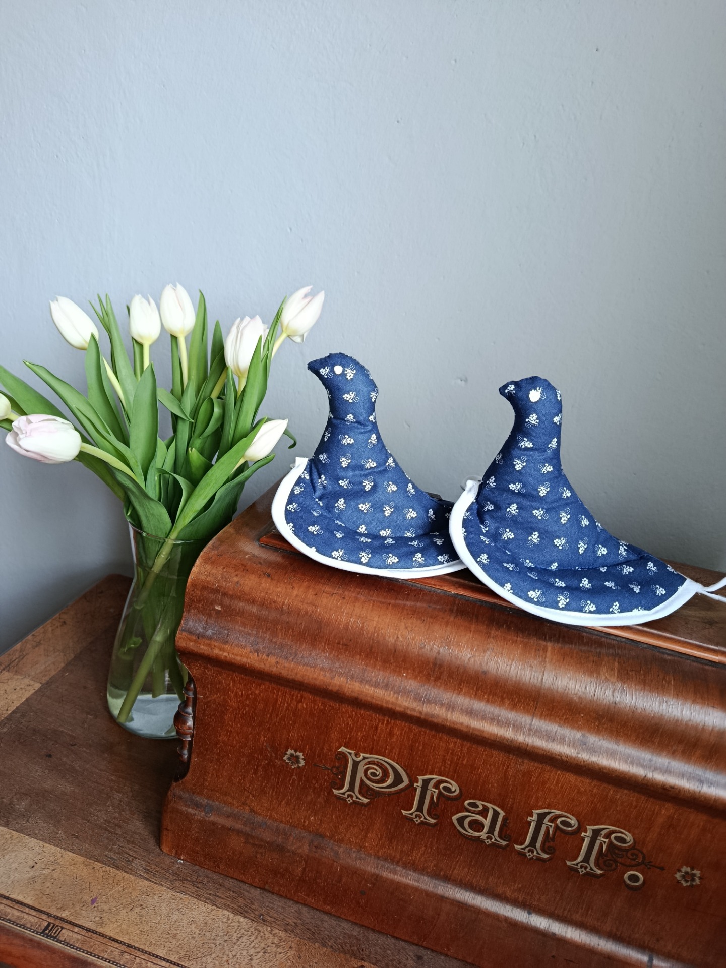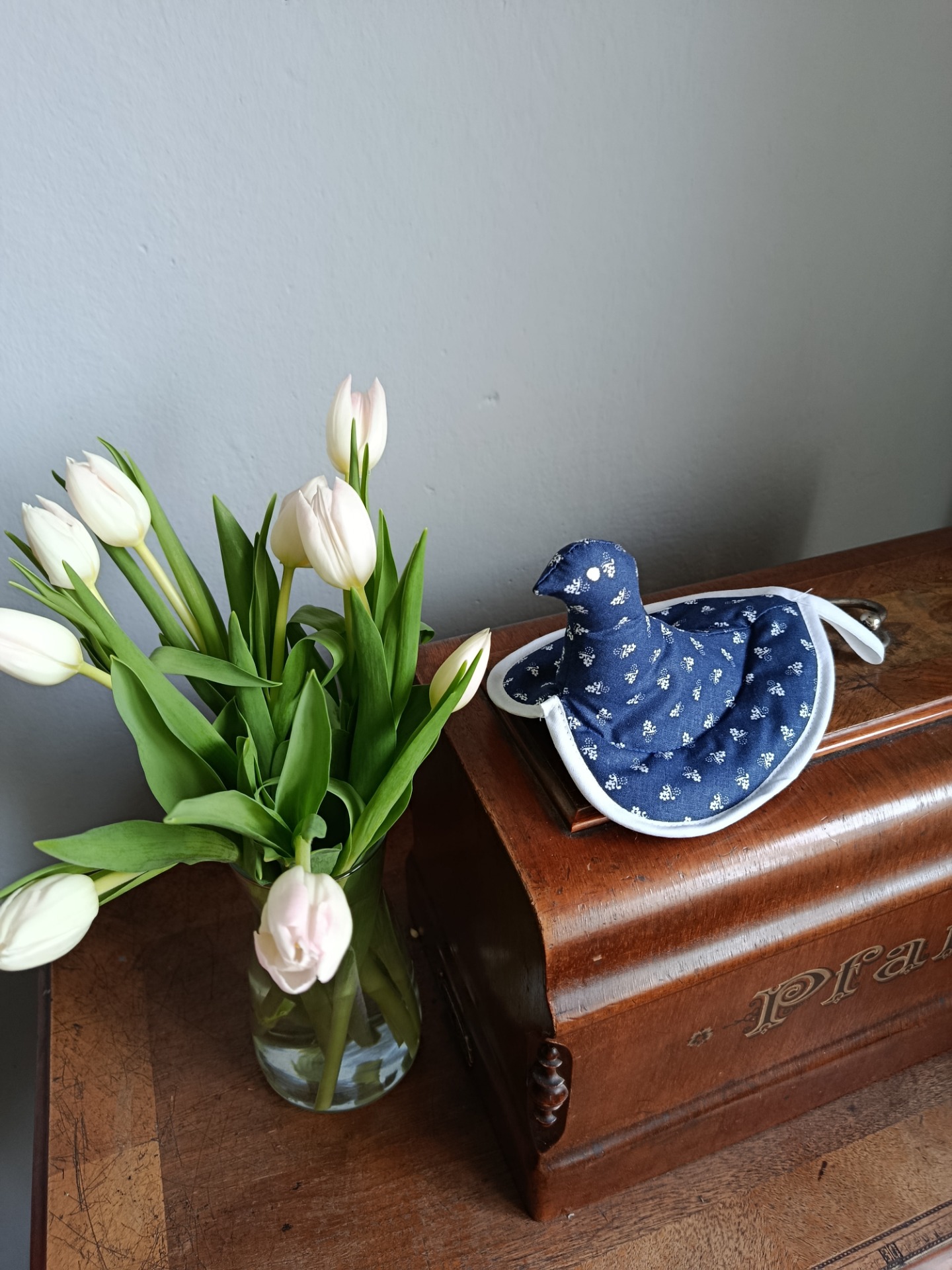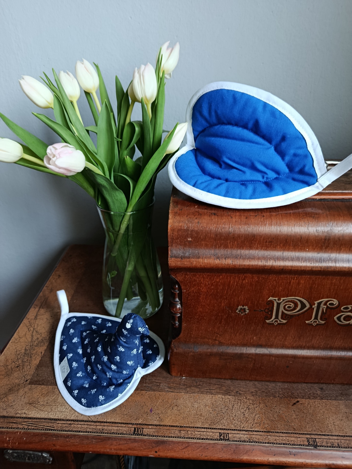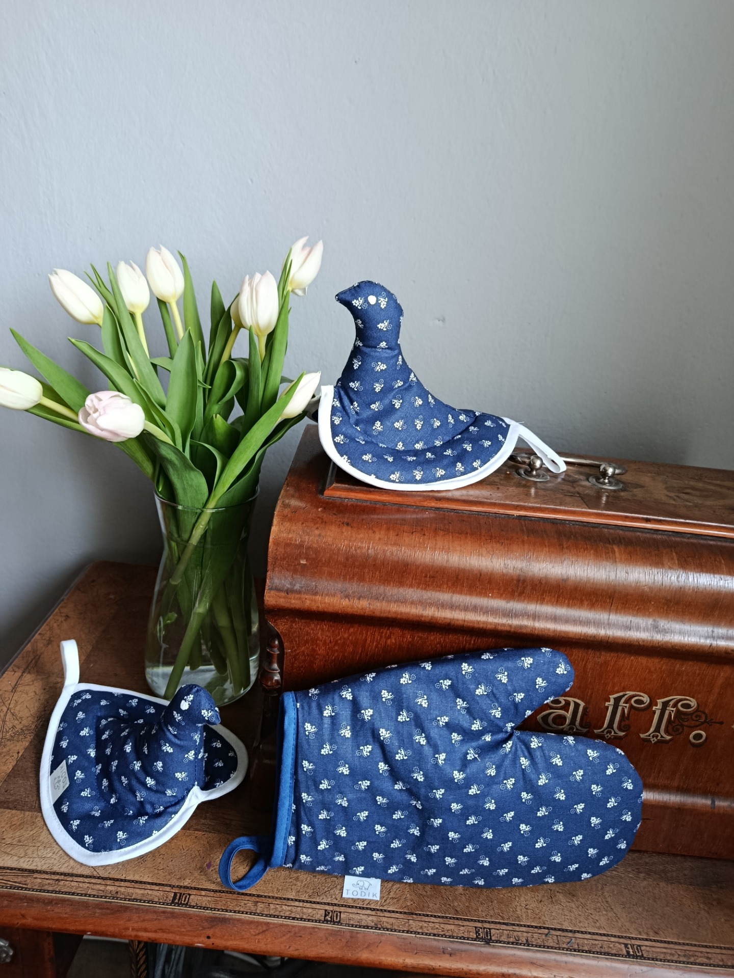 Je vyrobena z bavlněného plátna, s potiskem drobných bílých kytiček na tmavě modrém podkladu, vyplněné vatelínem, spodní strana je opět z bavlněného plátna.