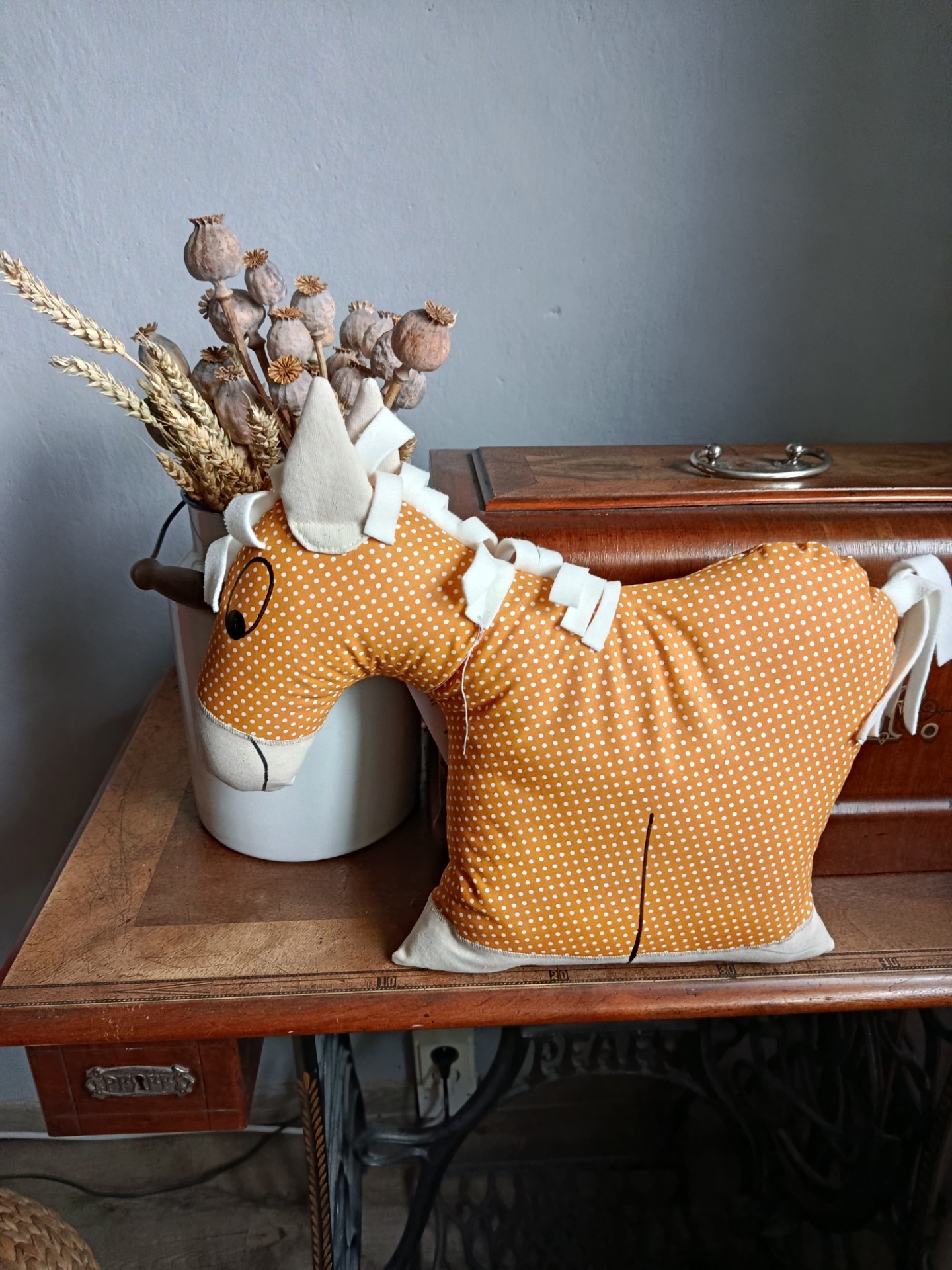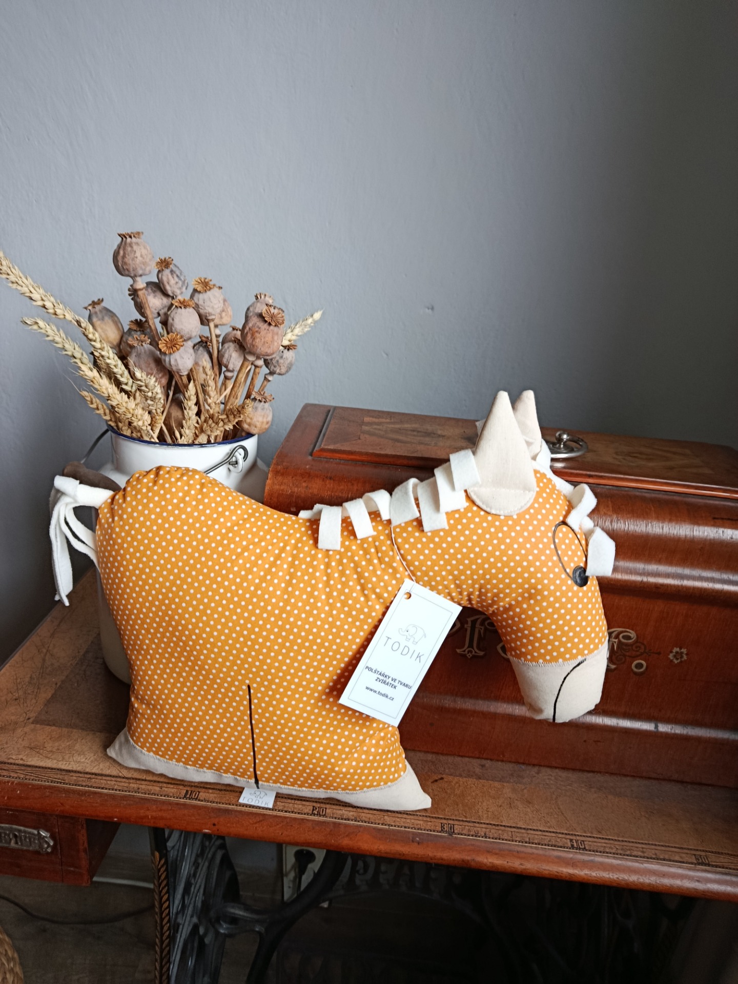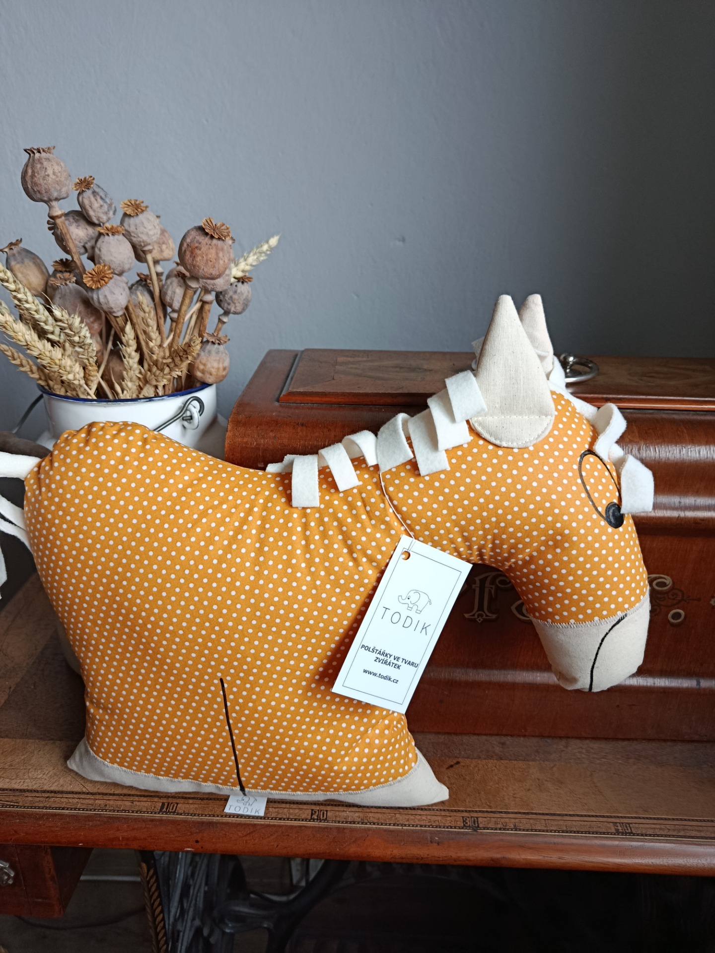 Je vyroben z bavlněného plátna české výroby s dokreslenými detaily barvou na textil. Plněno dutým vláknem. Snadná údržba, lze prát v pračce.